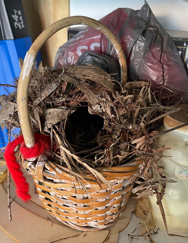 In our garage on a shelve is a small basket we decided to keep, because of it being a gift plus it’s a “cutie”. The only problem, it’s in the garage, and mom and dad wrens have located it and have been very busy making it their home to raise their babies. When we are home we leave garage door opened, but at night we close it. It’s a conundrum for us. We don’t want to leave our garage door opened and then again, we do not want keep the wrens away from their home.